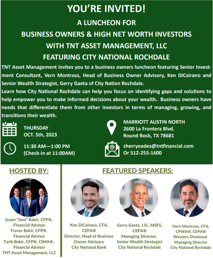 TNT Asset Management invites you to a business owners and high net worth investors luncheon featuring Senior Investment Consultant, Vern Montross, Head of Business Owner Advisory, Ken DiCairano and Senior Wealth Strategist, Gery Gaeta of City Nation Rochdale.
